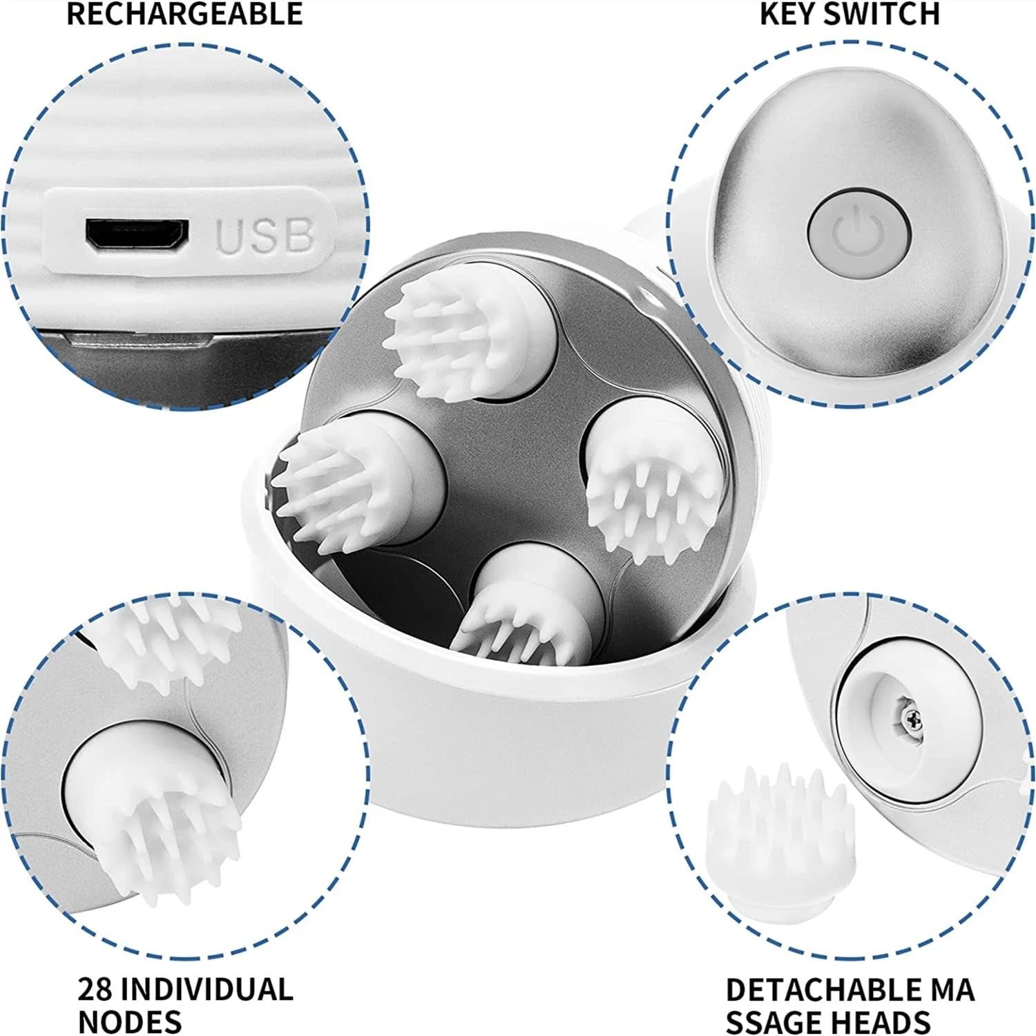 - [Scalp Massager]: scalp massager has four scalp massaging heads with a total of 28 kneading nodes. These can rotate clockwise and counterclockwise, giving sensational relaxation to the scalp, While kneading on the scalp, it helps to improve blood circulation, relaxes nerves, reduce stress, improves quality of sleep, and promote hair growth. At the same time as it massages , it also cleans your scalp.