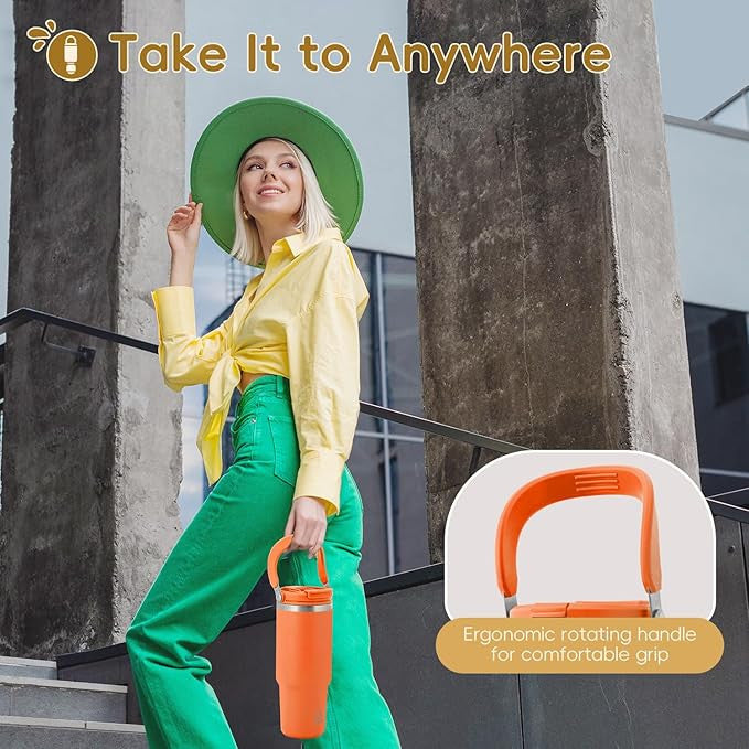- Take It to Anywhere: The ergonomic rotating handle lets you grab this insulated tumbler comfortably and go. The curved handle molds to the shape of the bottle, it won't take up any space when you are camping, hiking, walking or driving.