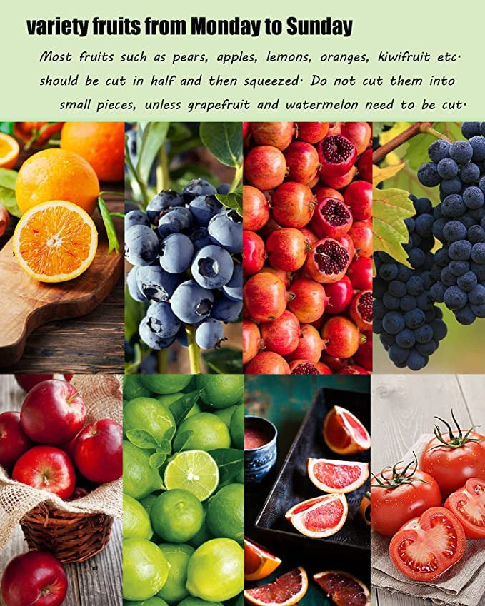 8. When squeezing grape-like granular fruits, please try to fill the juicer as much as possible, which is conducive to fully squeezing the juice. If there is only a small amount of fruit, it will create too much space to effectively squeeze the fruit.